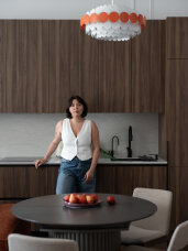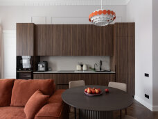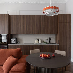 Гостиная стала визитной карточкой квартиры, потому что, зайдя в дом, мы сразу попадаем сюда. В гостиной разместился большой яркий диван, где по выходным собираются все члены семьи для совместного просмотра фильмов. Стильная и функциональная кухня дополнена эффектной люстрой и служит гармоничным продолжением гостиной