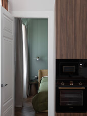 Спальня оформлена в сочных зелёных тонах с элементами классического декора: изголовье кровати с тканевой обивкой, стильное подвесное освещение и паркет «шеврон» создают атмосферу уюта.